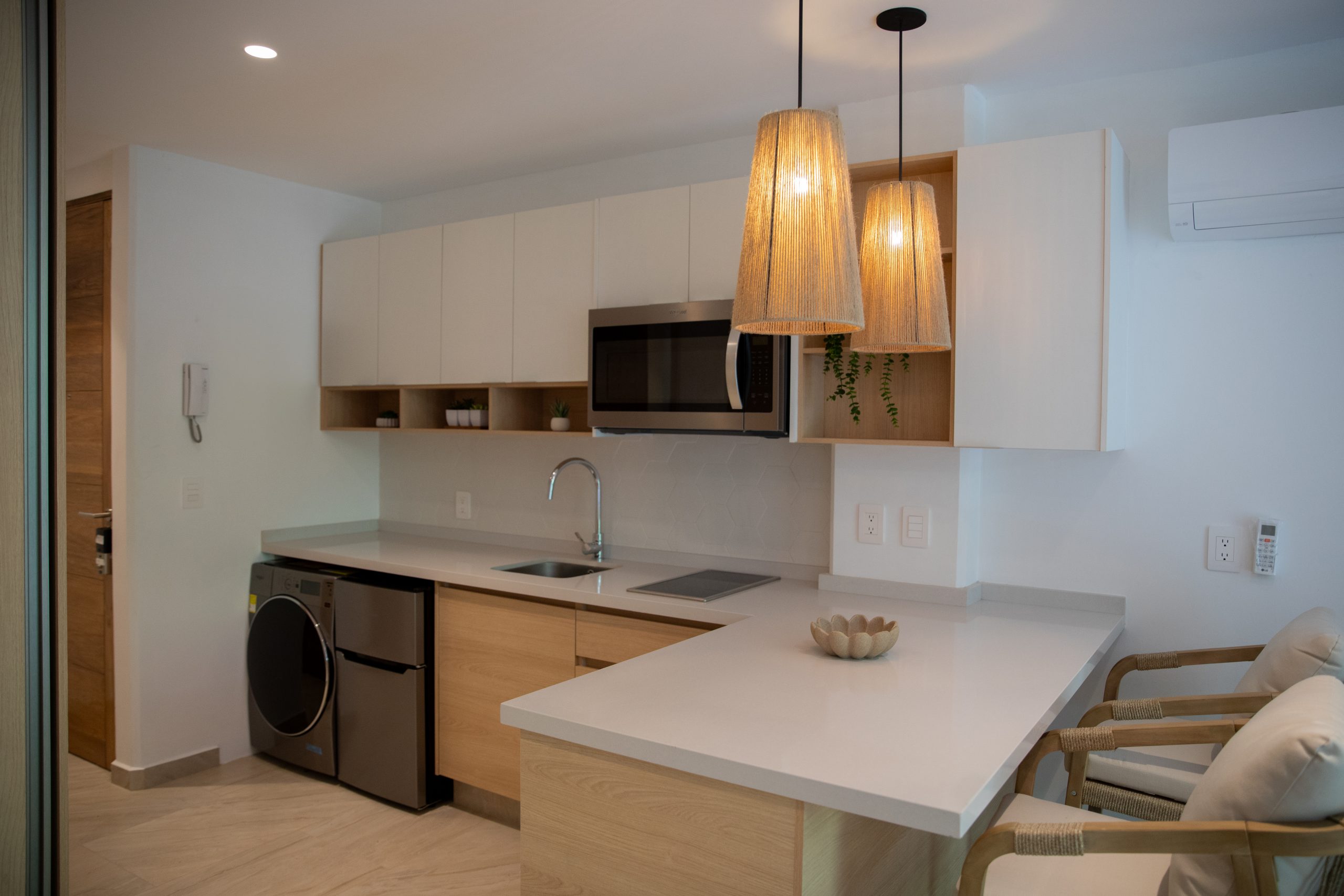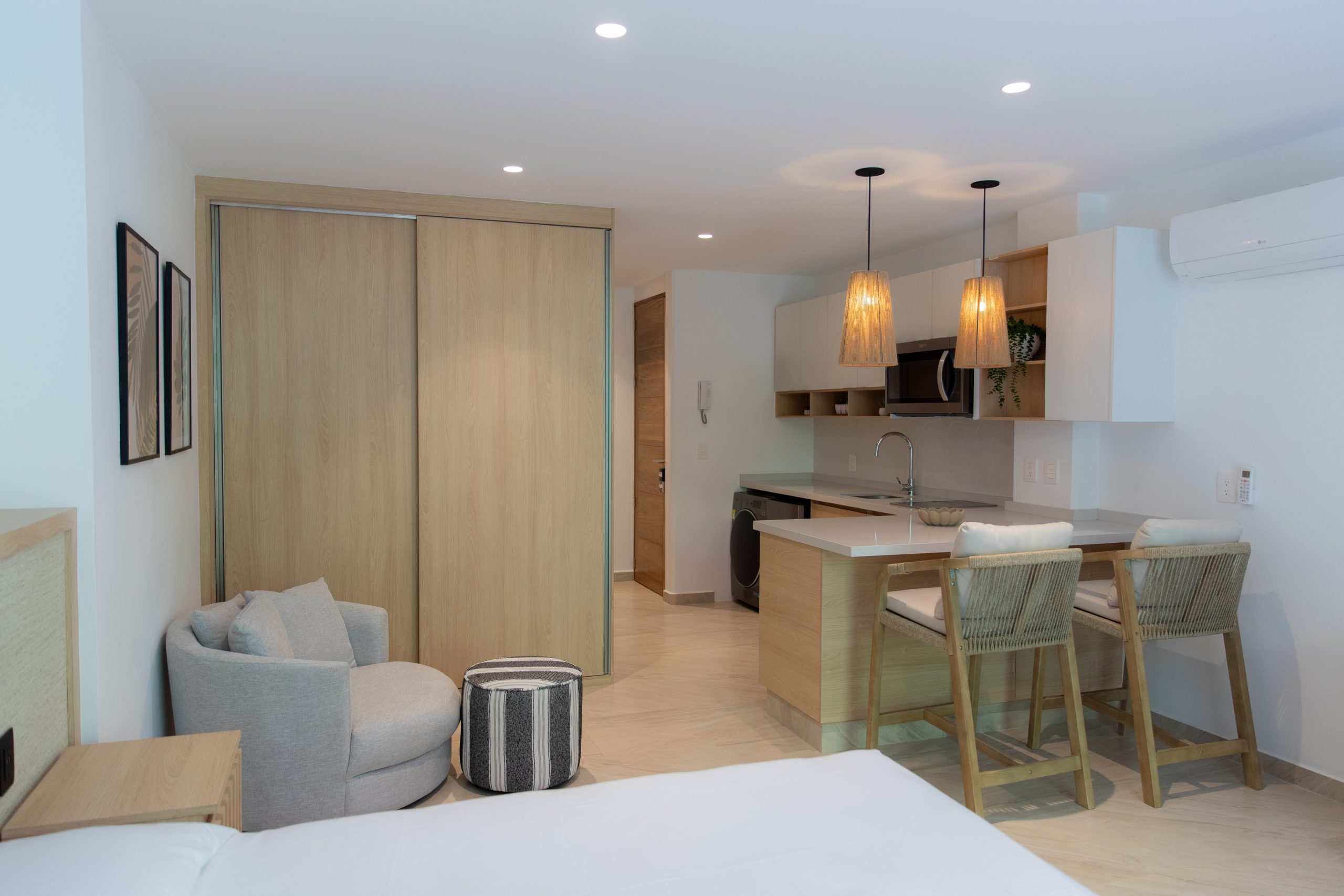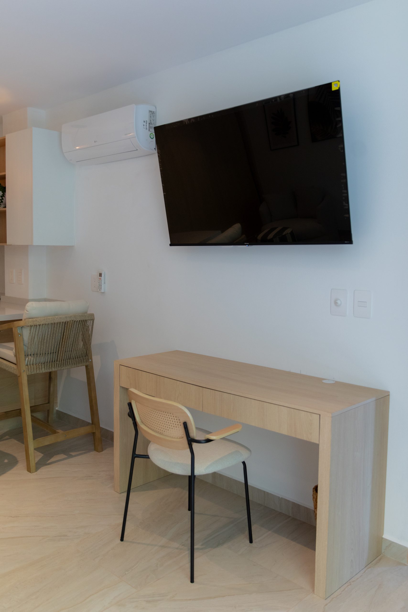 Beautiful full- furnished studio of 52 m2. Fully equipped kitchen with stove, mini fridge, microwave and wash-dryer. Studio has one full bathroom, queen size bed, air conditioned and terrace.